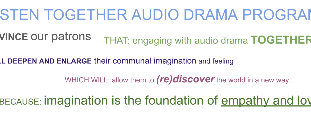 The Listen Together Audio Drama Program is based on the idea that engaging with audio drama together in a communal setting will deepen and enlarge our communal imagination and fellow feeling. A strong sense of fellowship and shared experience allows us to (re)discover the world in a new way. This approach is based on the idea that imagination is the foundation of empathy and love. By creating a context where people can communally experience something that engages their imagination, then supporting their engagement with each other within that context a strong sense of shared humanity will be created. While the Listen Together program can be enjoyed by almost all age groups, cohorting by a minimum age is likely to be key to success. This program also leverages everything we know about the power of fan communities and the binds that experience creates.