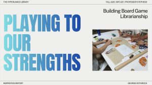 I saw the title of this report and knew I wanted to read it! I love these kinds of programs, and this was well executed. I love how you discuss how patrons would enjoy this and that it can be a good ice-breaker. Many people don’t see the value in leisure activities. Having fun should be valuable enough. However, there are so many more benefits than just that. I did a whole project one semester about the benefits of DND in libraries. It helped with a lot, including mental health, problem-solving, and public speaking. Thank you for sharing, George!!