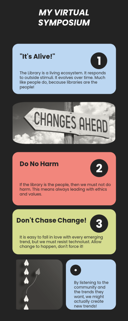 This brings me to my third point: let the people be the change—don’t go chasing change! While new trends can be exciting, we must ask ourselves whether our library truly desires or needs these changes. We should allow the library community to express what it wants. Who knows? You might even spark the next big trend.