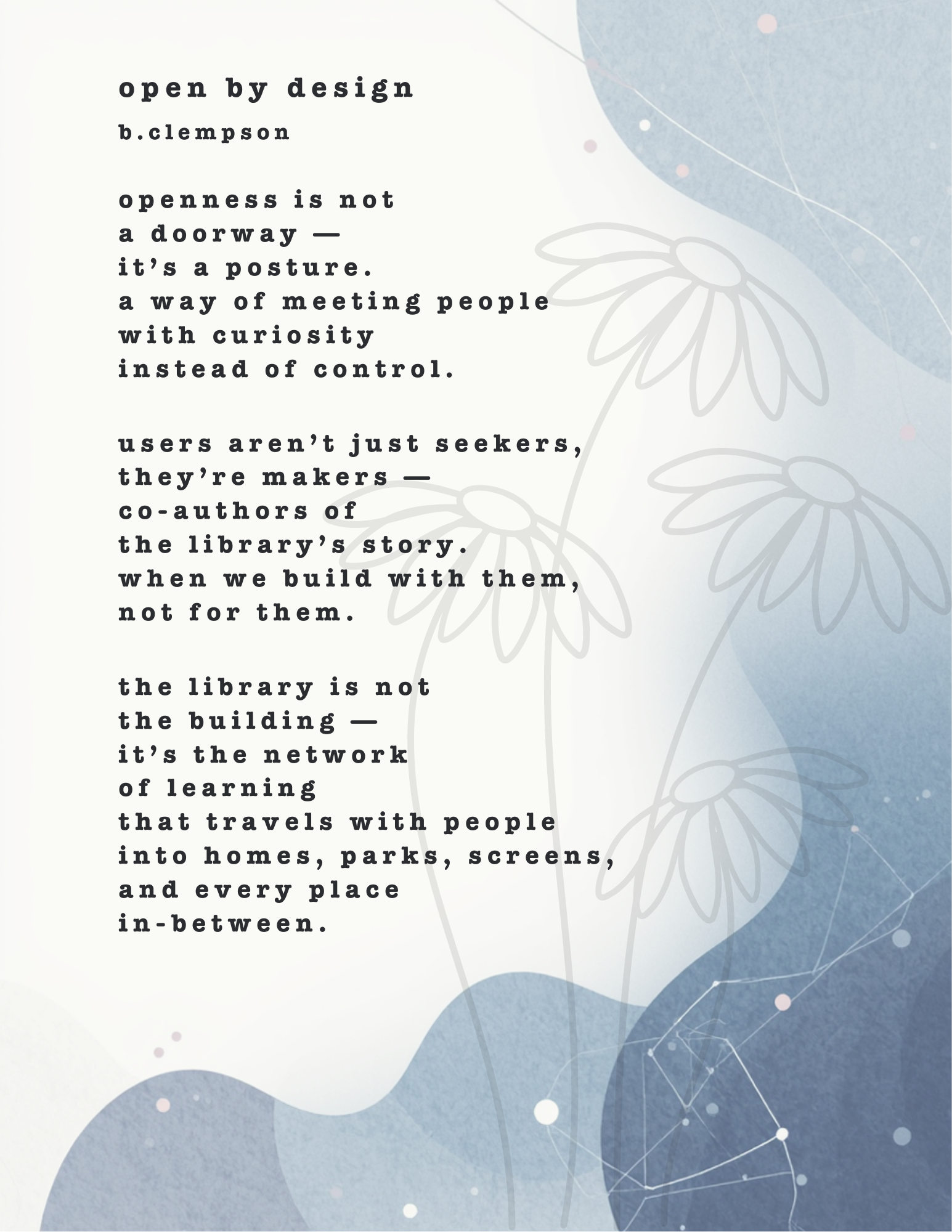 Thank you for the kind, thoughtful comments—almost always making me stop and consider things further. It’s been a wonderful semester and I wish you all the best on your MLIS journey and beyond.