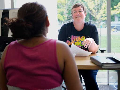 (Leah Hogsten | The Salt Lake Tribune) Nicole Campolucci, right, helps a woman experiencing homelessness with her Section 8 housing paperwork in the Salt Lake City Library, June 12, 2023. Campolucci is a licensed clinical social worker, and helps connect people experiencing homelessness with available resources.